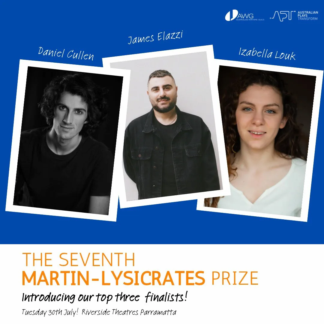 From a large number of playwrights that submitted the first act of their play, these are the three finalists: Daniel Cullen with his play "Outside Dogs", James Elazzi with his play "Kufa the Hero", and Izabella Louk with her play "'These Youths' be Protesting".